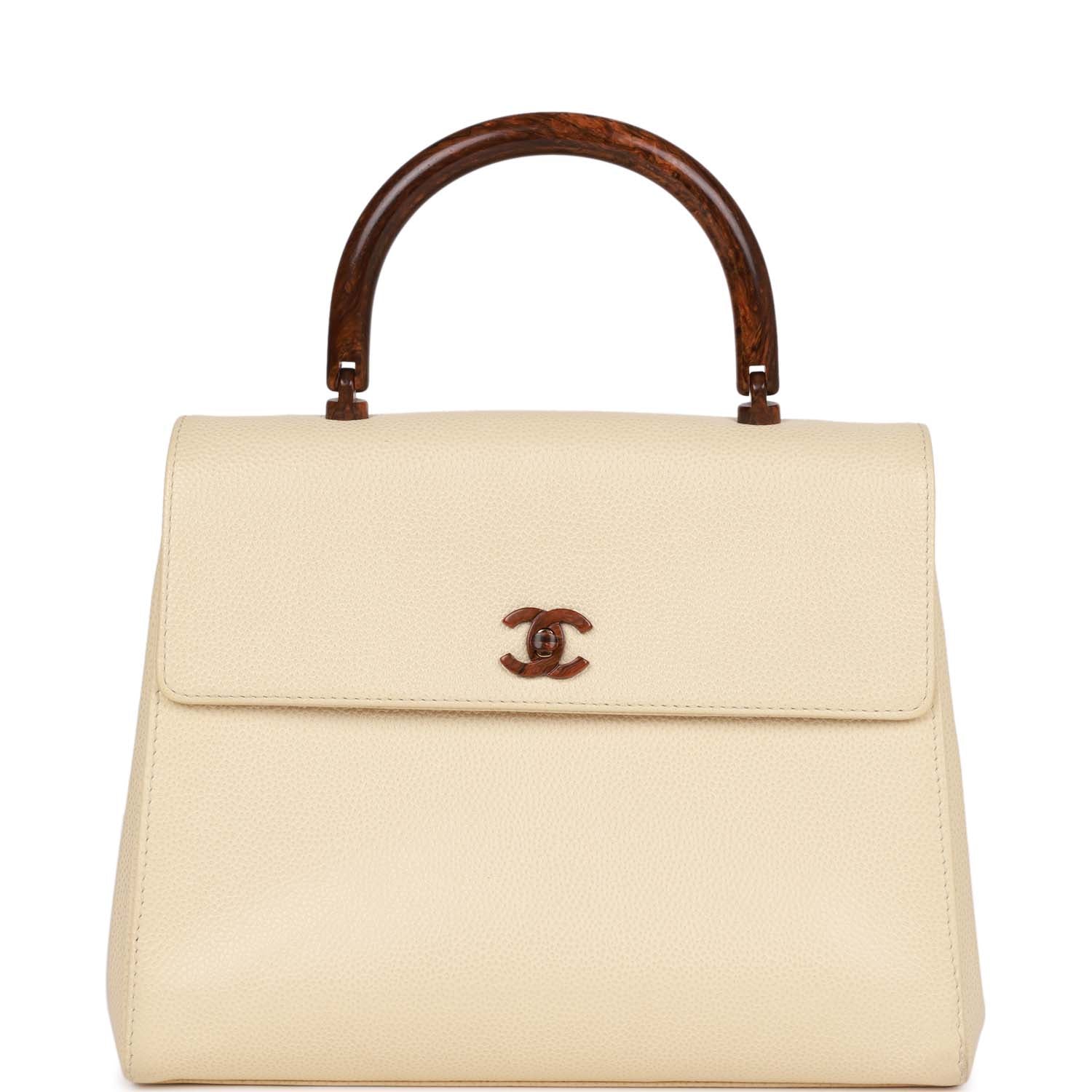 This Vintage top handle bag is in Ivory caviar leather bag with signature cc turnlock front flap, and features a wood detail top handle.