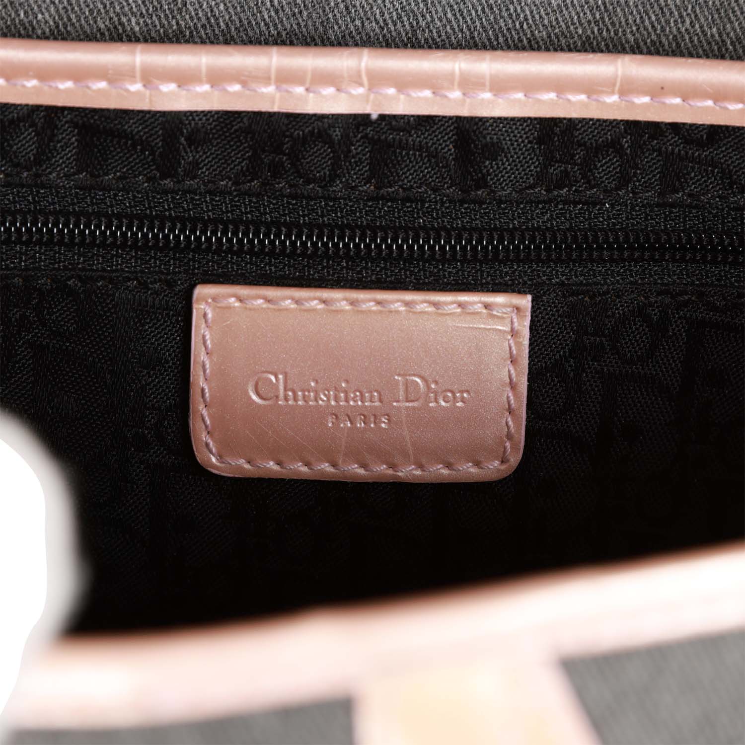 The interior is lined in black patterned silk with one zip pocket.