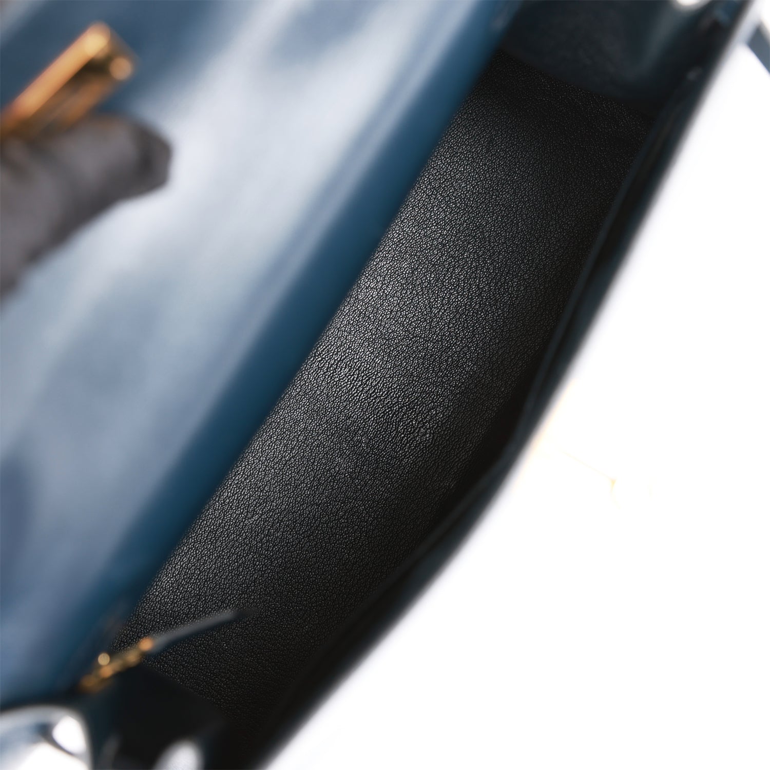 This Sellier Kelly is in Bleu Marine box with gold hardware and has tonal stitching, front flap, two straps with center toggle closure, clochette with lock and two keys, single rolled handle and removable strap.