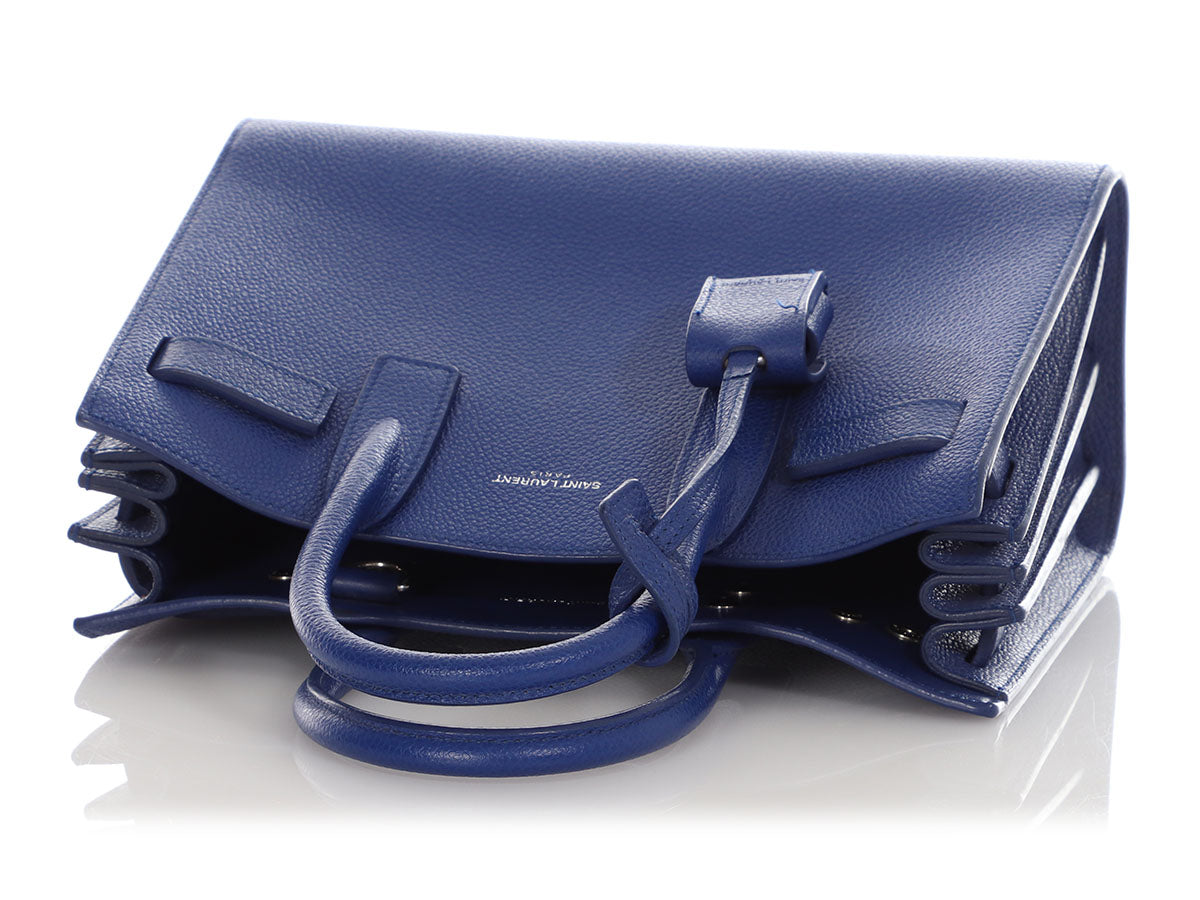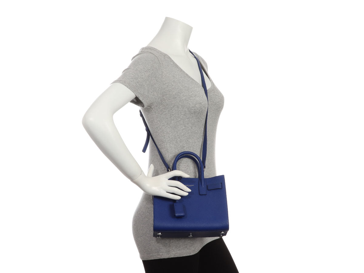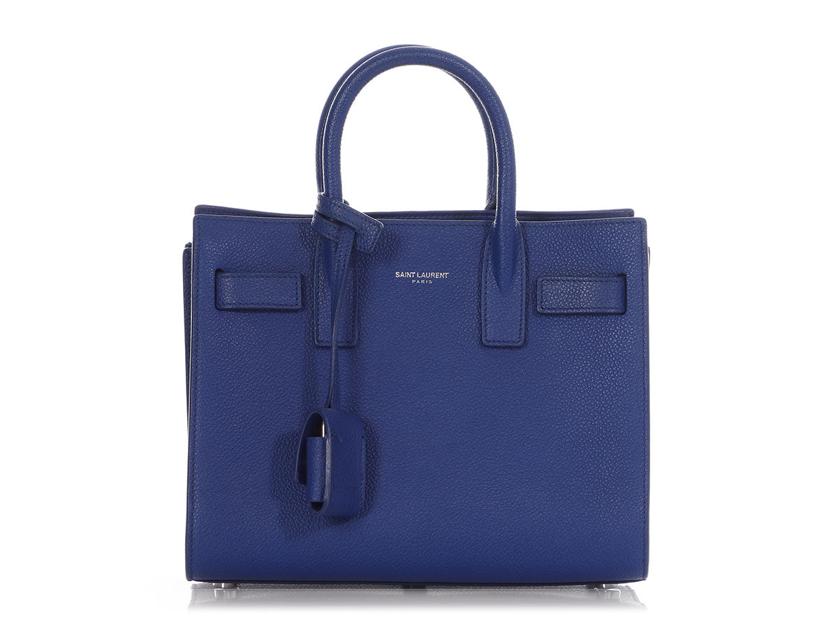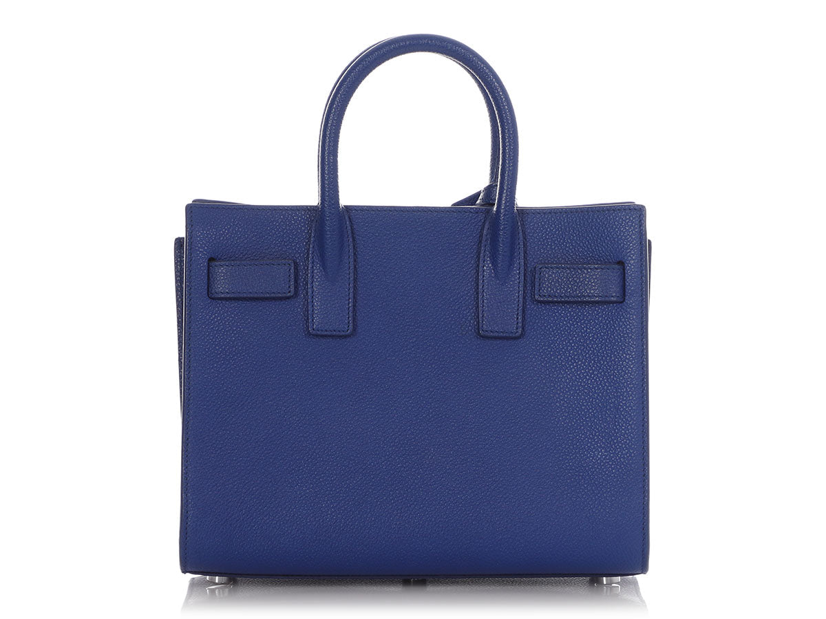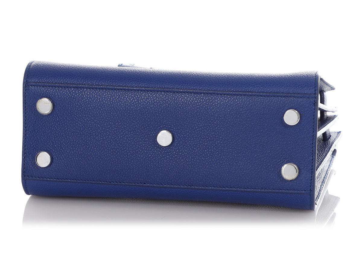 I love the sophisticated structure of Saint Laurent’s Nano Blue Sac De Jour, and I’m absolutely crazy about the color! Made of thick, grained blue leather, it’s an open-topped tote lined in matching leather. In very good condition with a clochette and lock, the silver hardware has light scratches, the inside has some scratches and marks, and it has a light perfume smell. There’s a 2.75-inch drop to the top handles, while the adjustable, detachable shoulder strap is shown with a 21.5-inch drop to carry this beautiful blue baby hands-free!