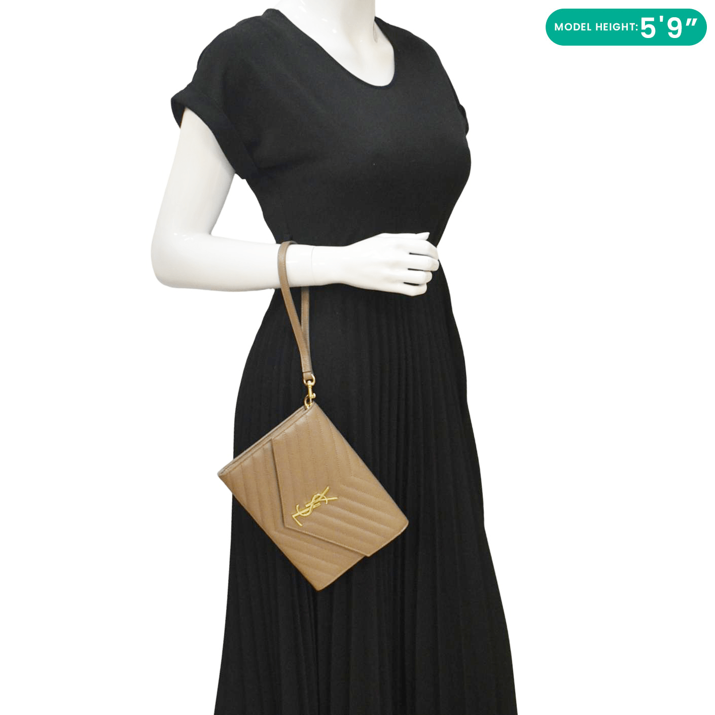 The Yves Saint Laurent Cassandre Flap Leather Pouch in Beige features the iconic YSL logo on a sleek, compact design. Made from luxurious leather, it's a chic accessory for day or night.