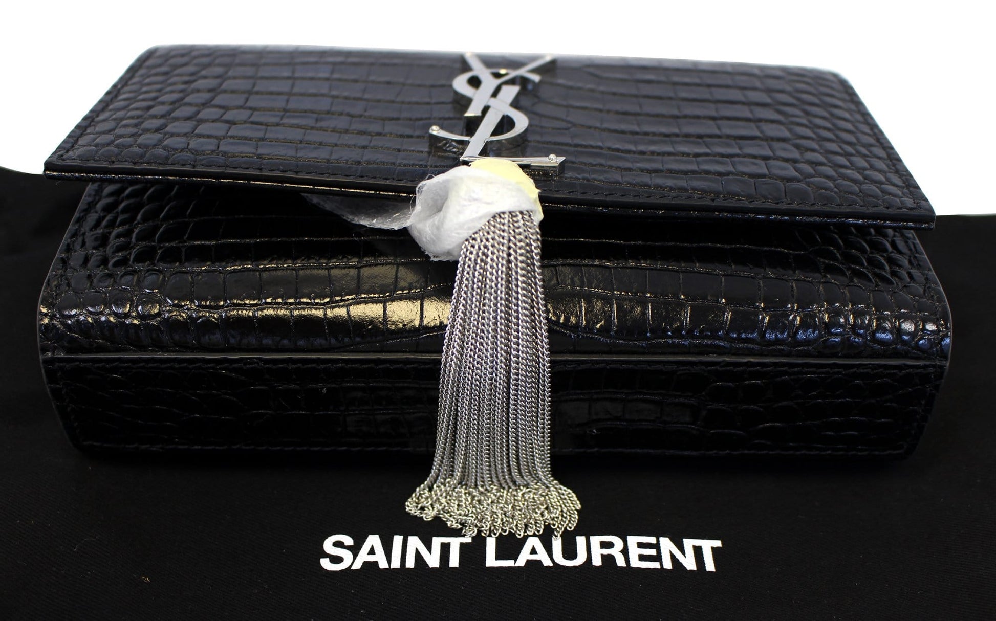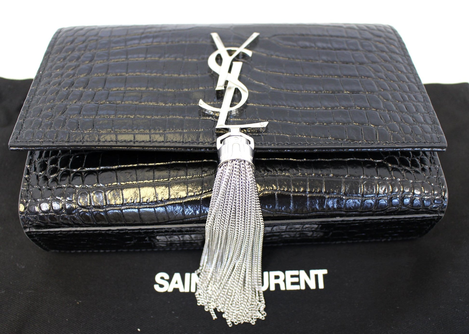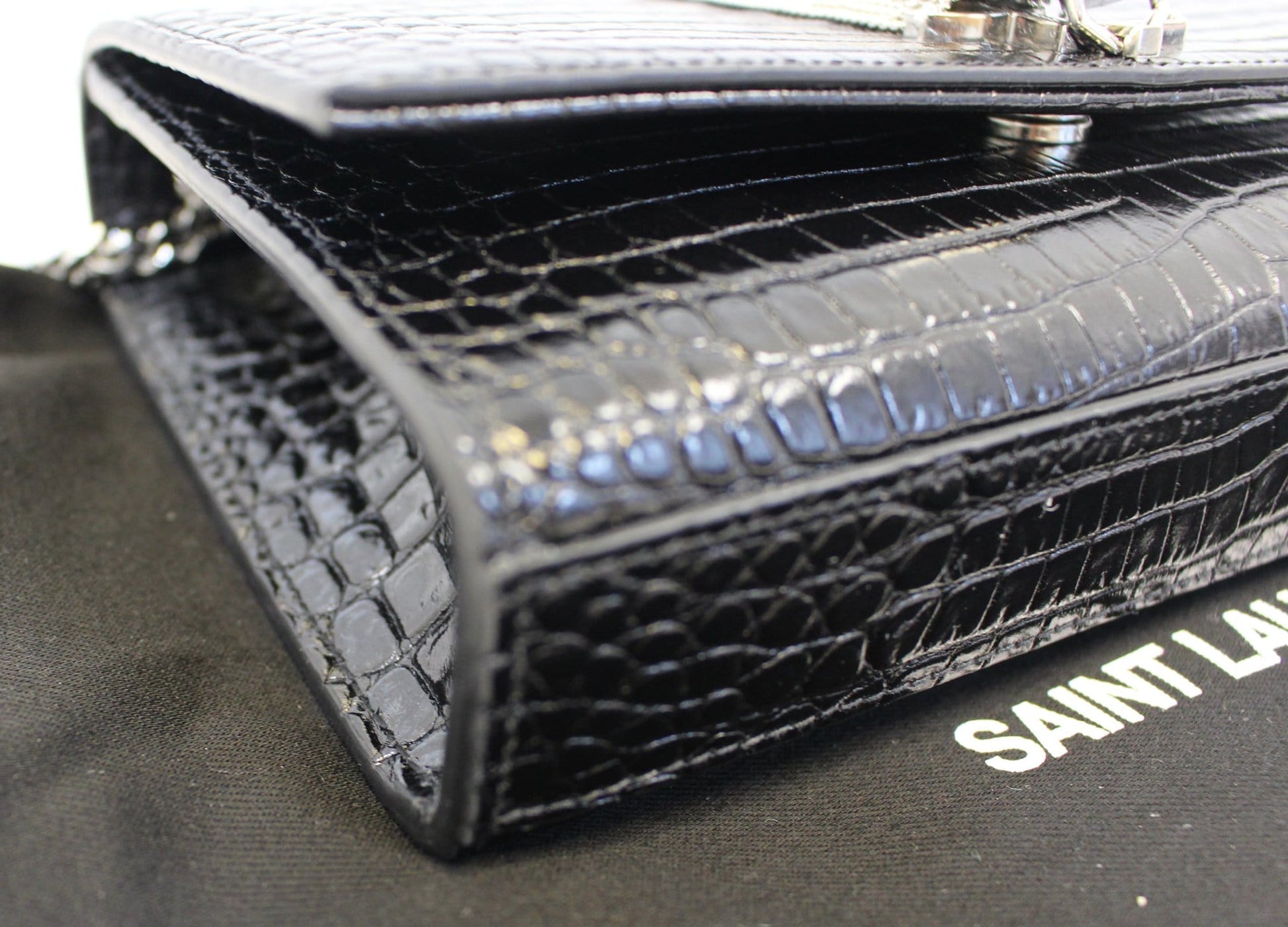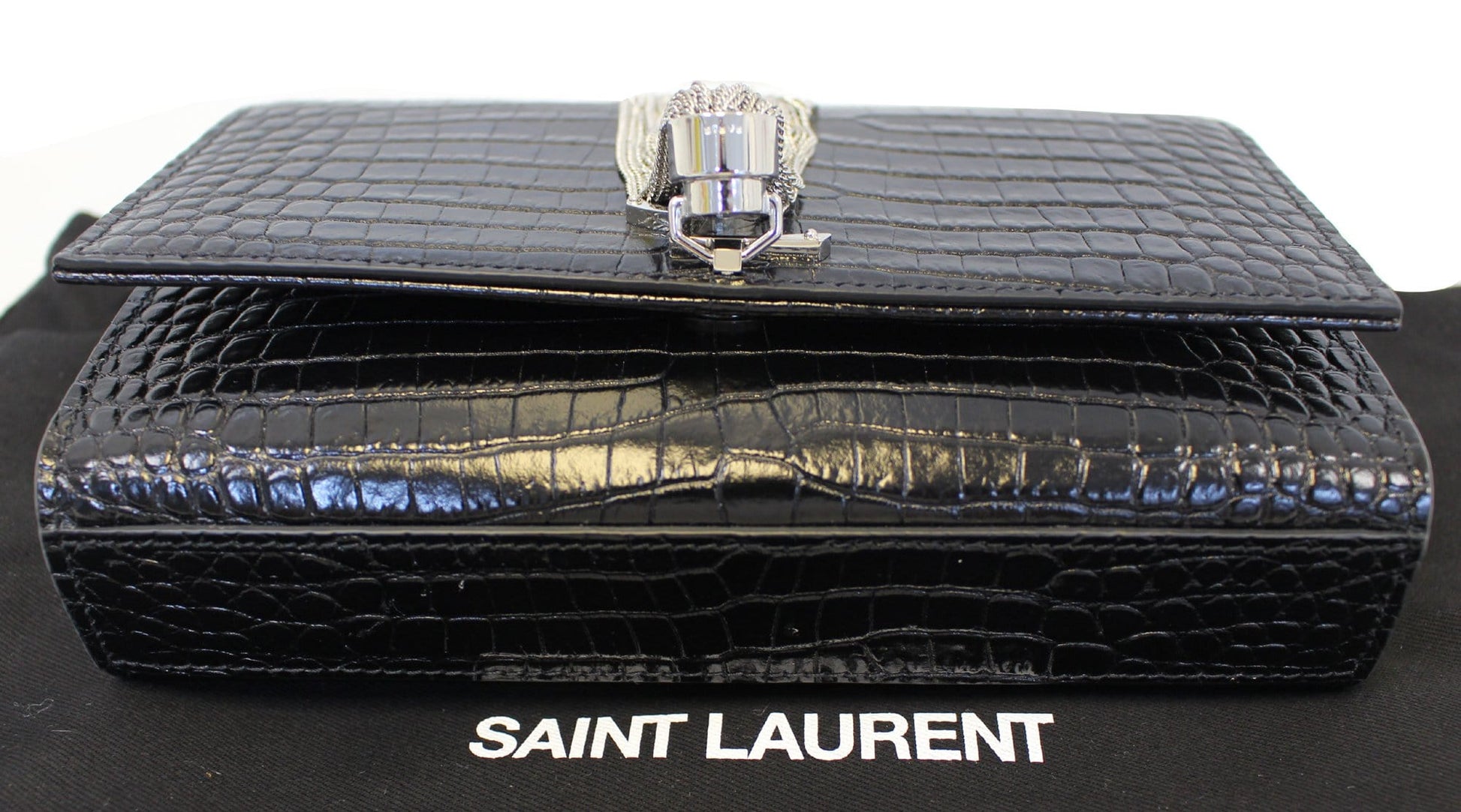 YVES SAINT LAURENT Crocodile Black Leather Silver Chain Clutch Crossbody Bag