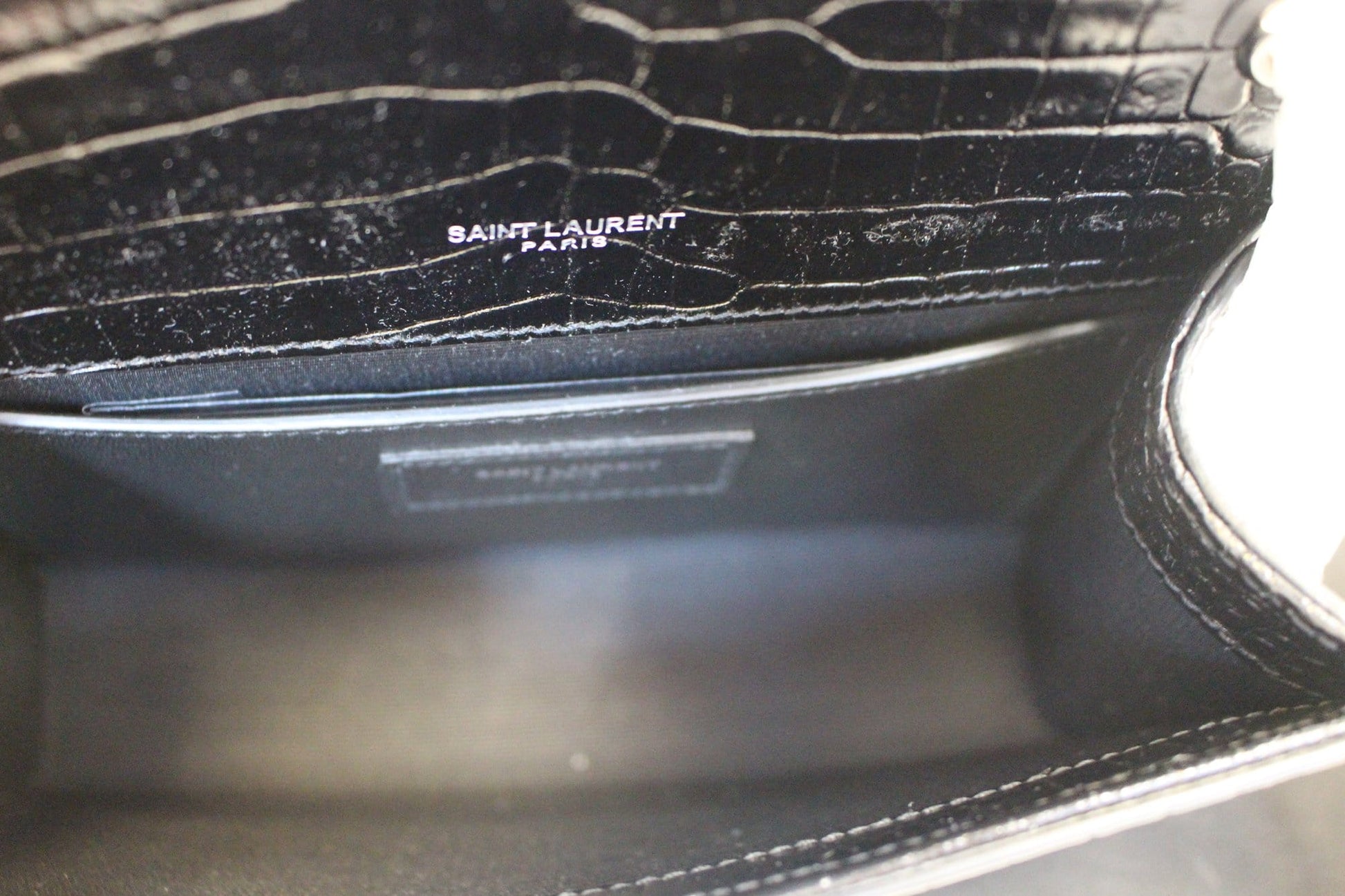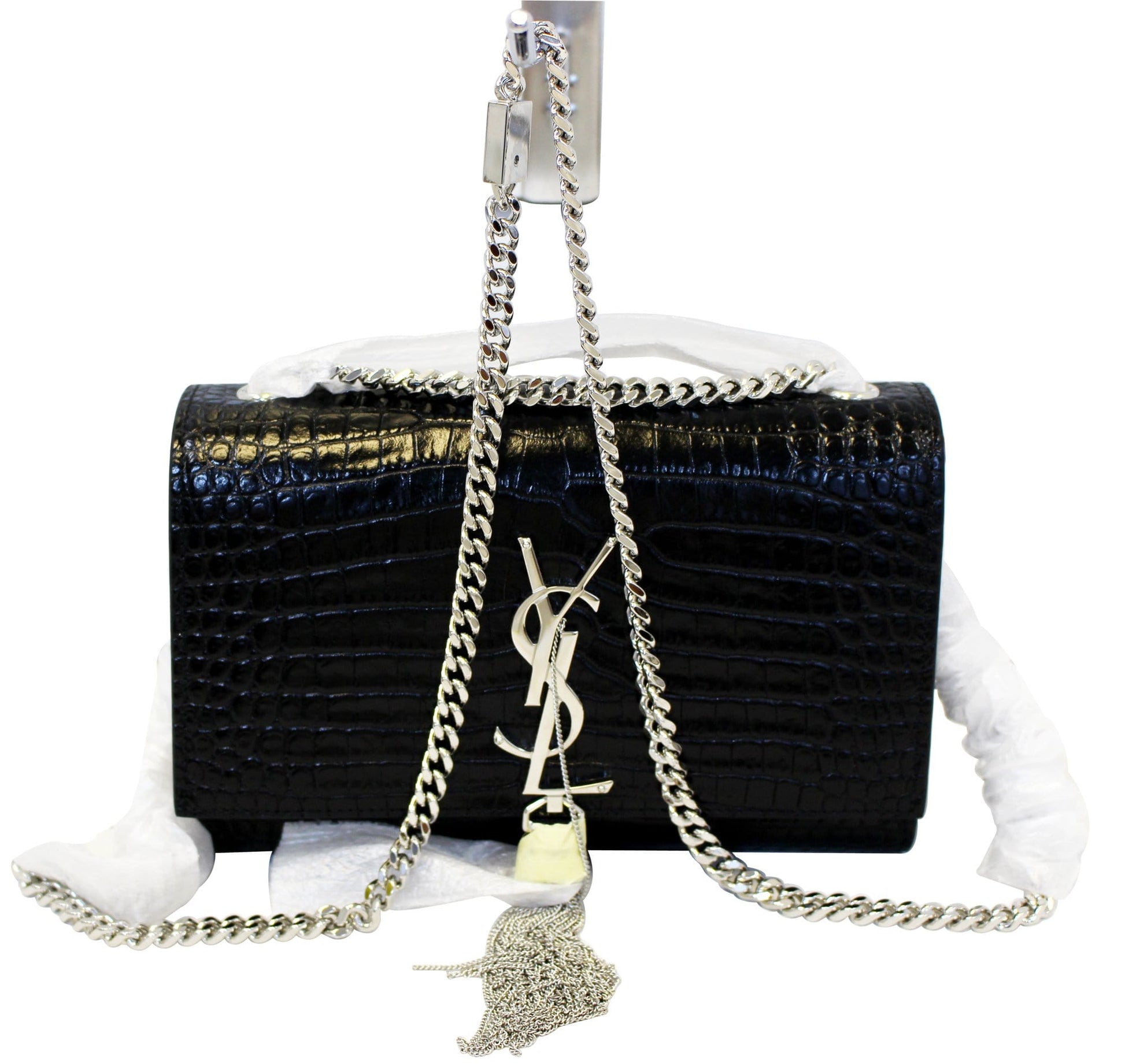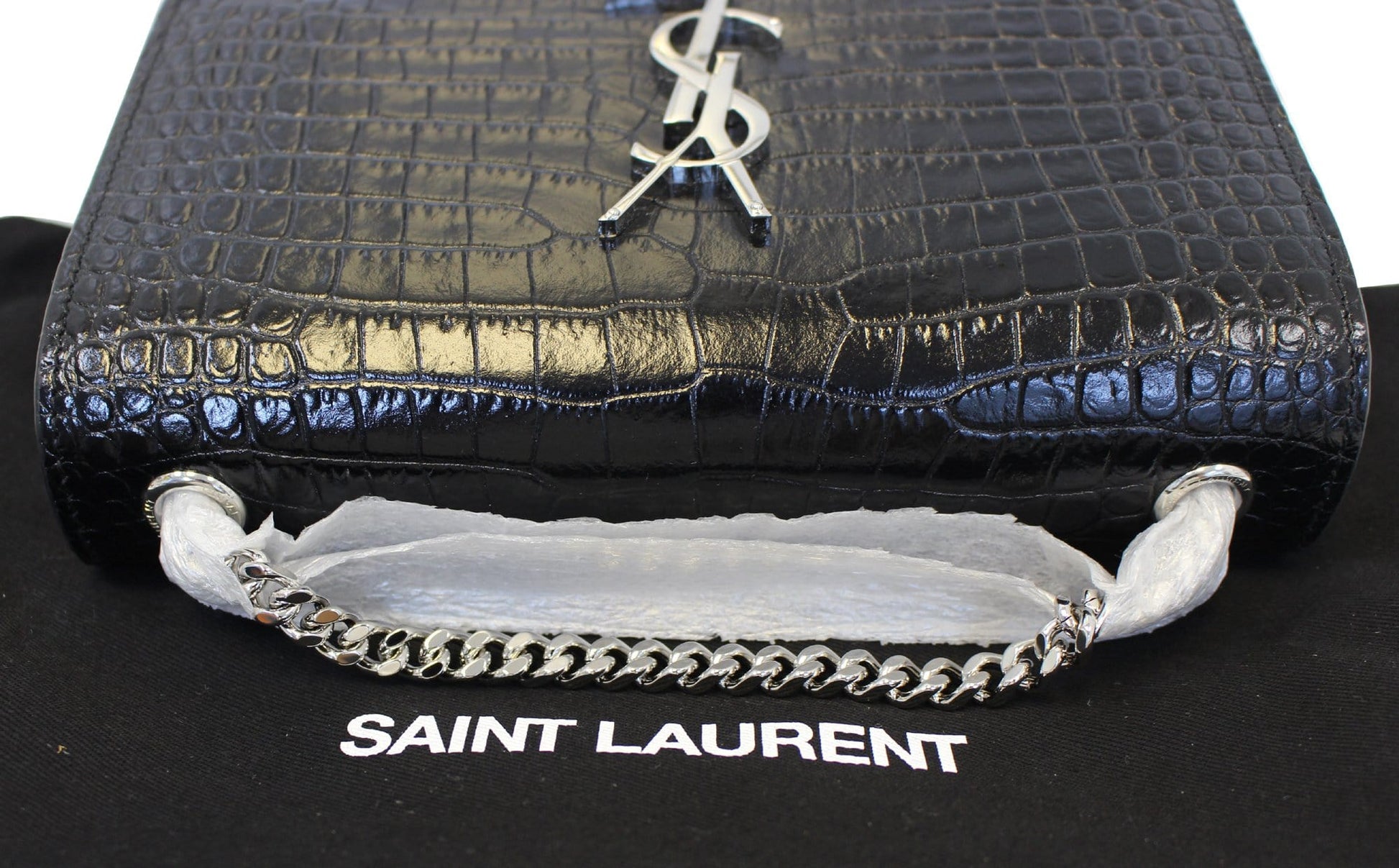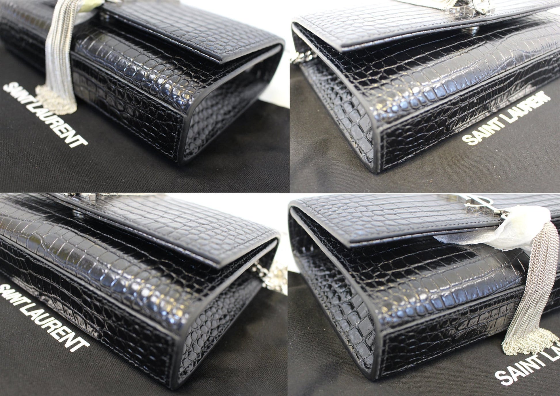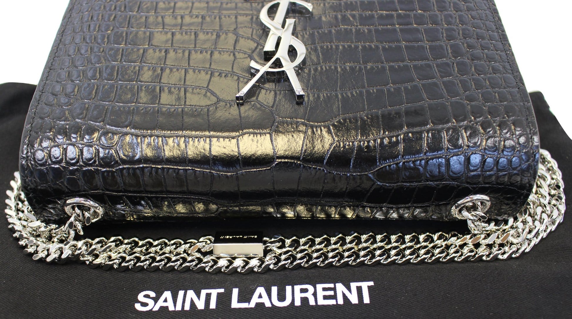 YVES SAINT LAURENT Crocodile Black Leather Silver Chain Clutch Crossbody Bag