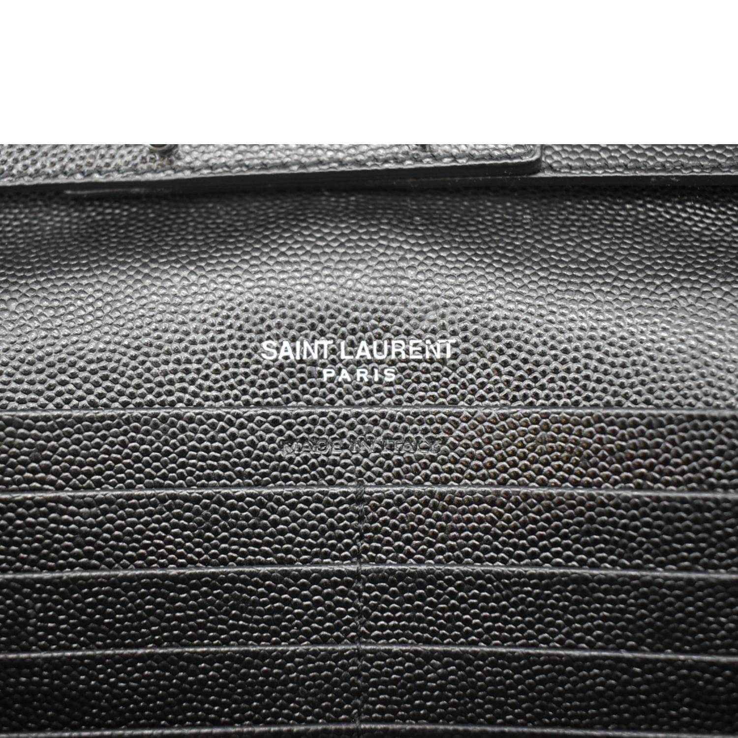 The YVES SAINT LAURENT Envelope Chain Wallet in black chevron-quilted leather features the iconic YSL logo in silver-tone hardware. This elegant crossbody bag offers a sleek and sophisticated design, perfect for both evening wear and day-to-night transitions.