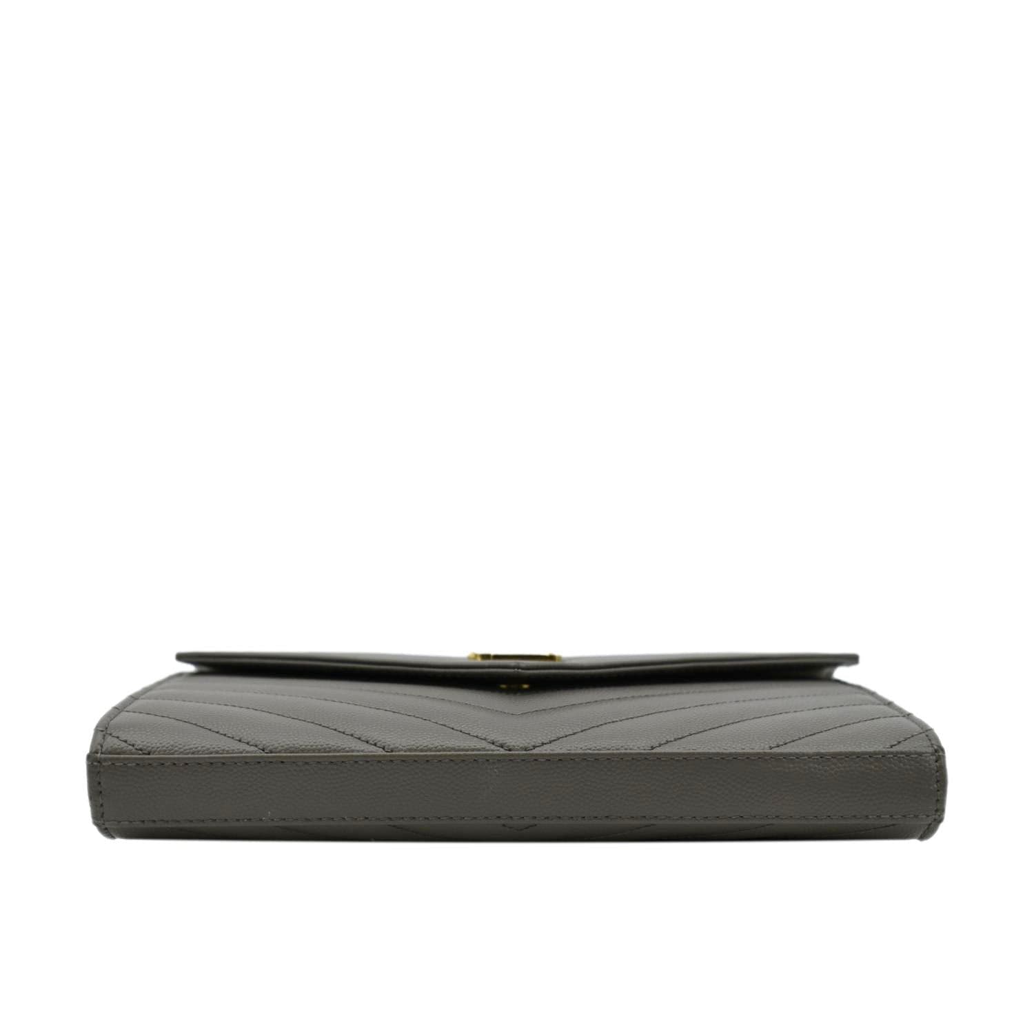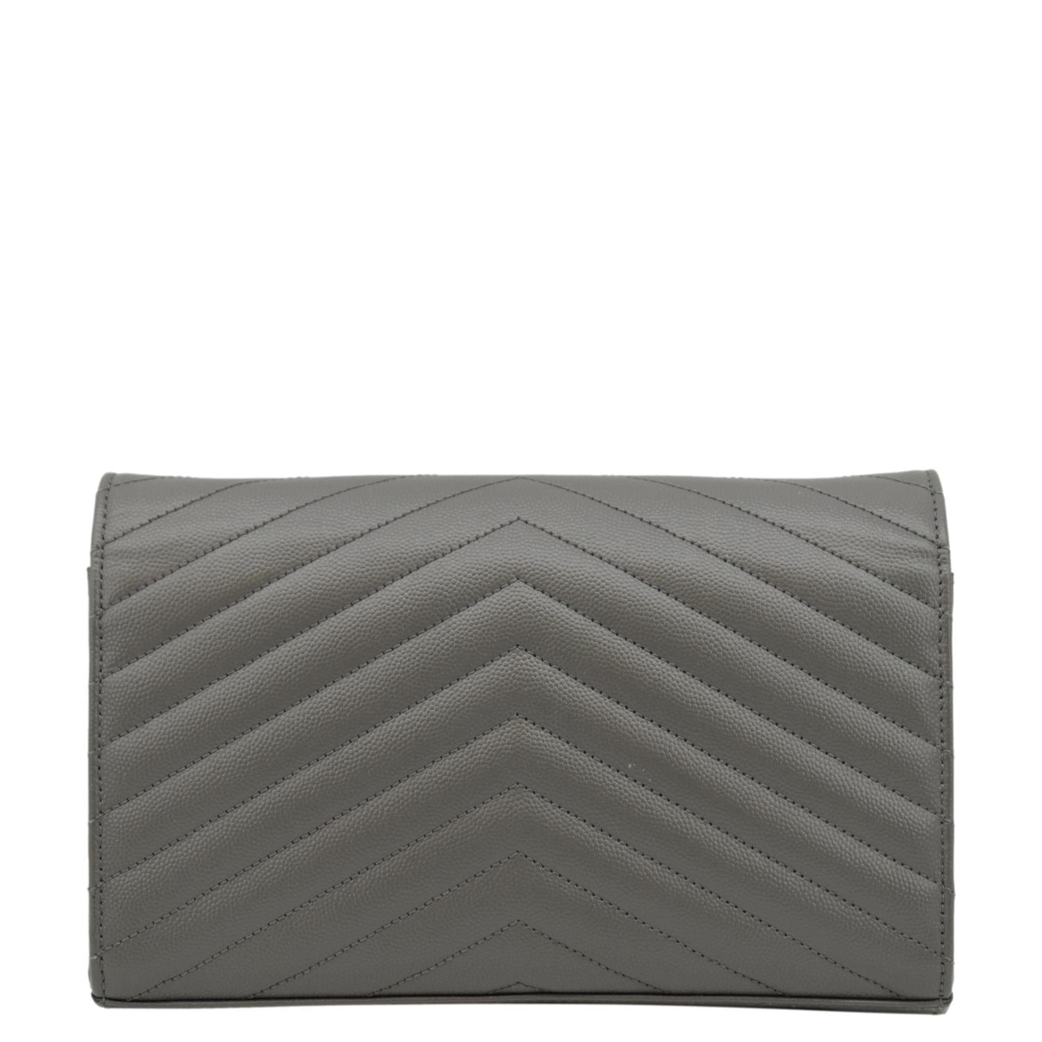 The YVES SAINT LAURENT Kate Leather Chain Clutch Crossbody Bag in Grey combines sleek leather craftsmanship with a versatile chain strap, offering effortless sophistication and practicality for day or evening wear.