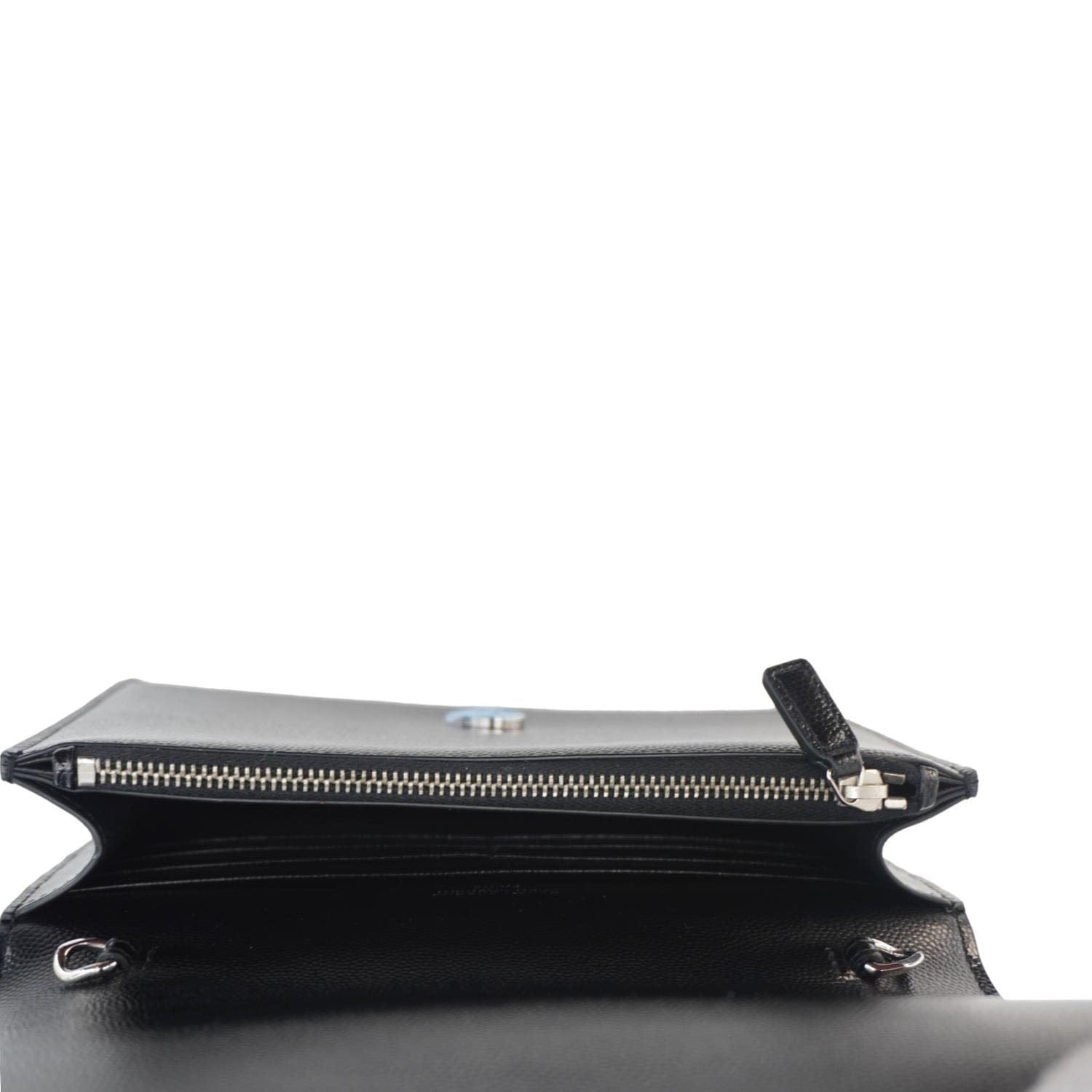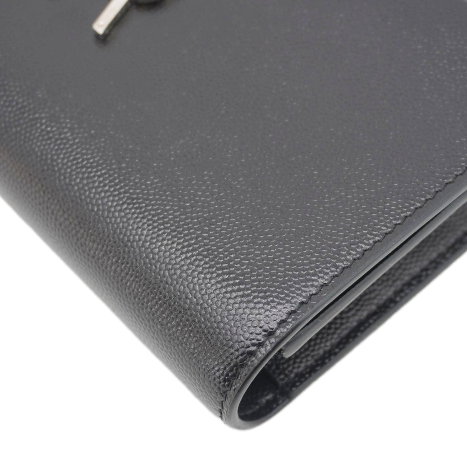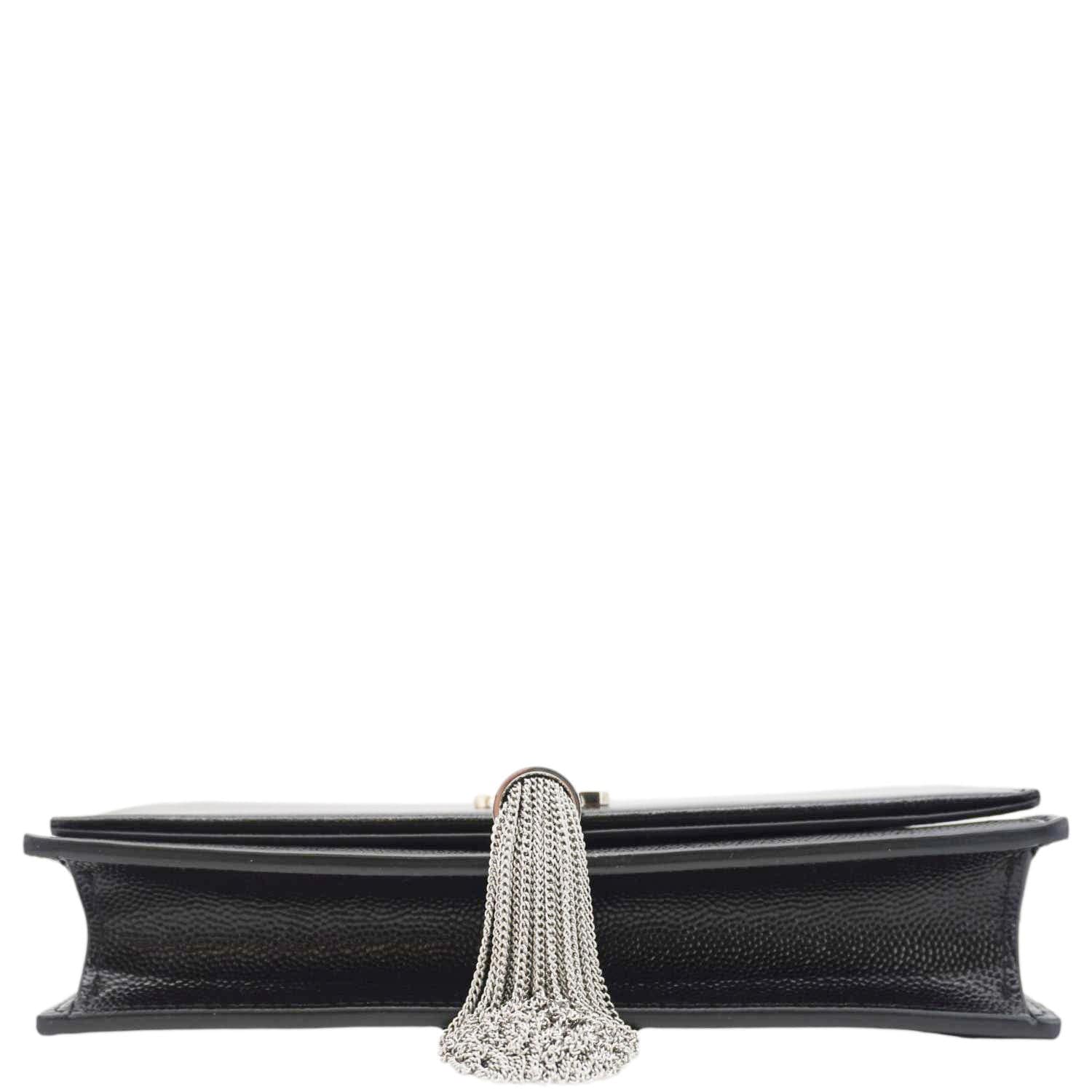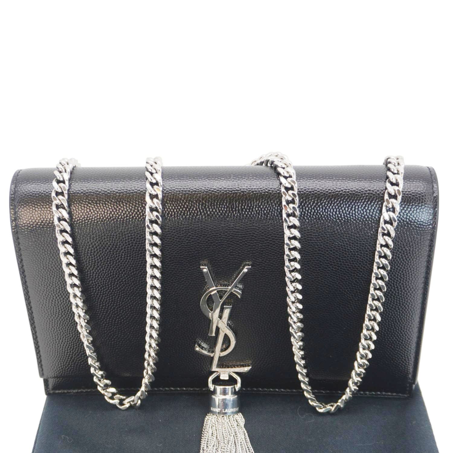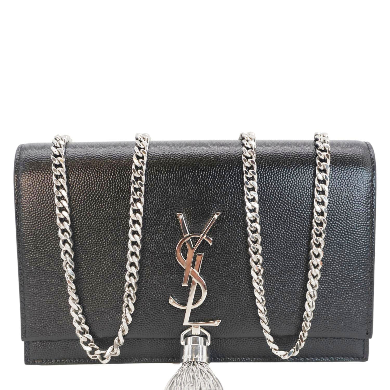 The Yves Saint Laurent Kate Tassel Crossbody Bag in black leather is a timeless and elegant piece. Adorned with the iconic YSL logo and a sleek chain tassel, it features a compact design and a chain strap for effortless sophistication.