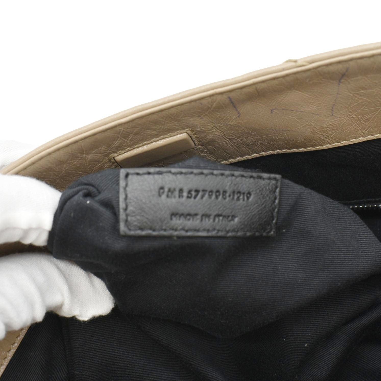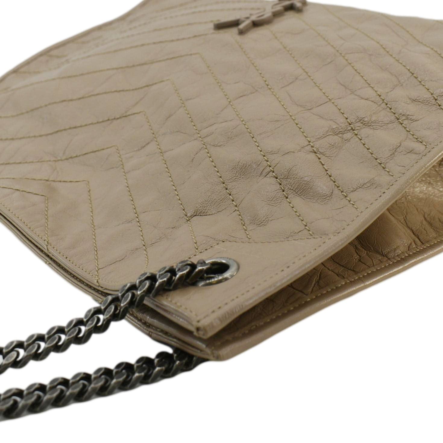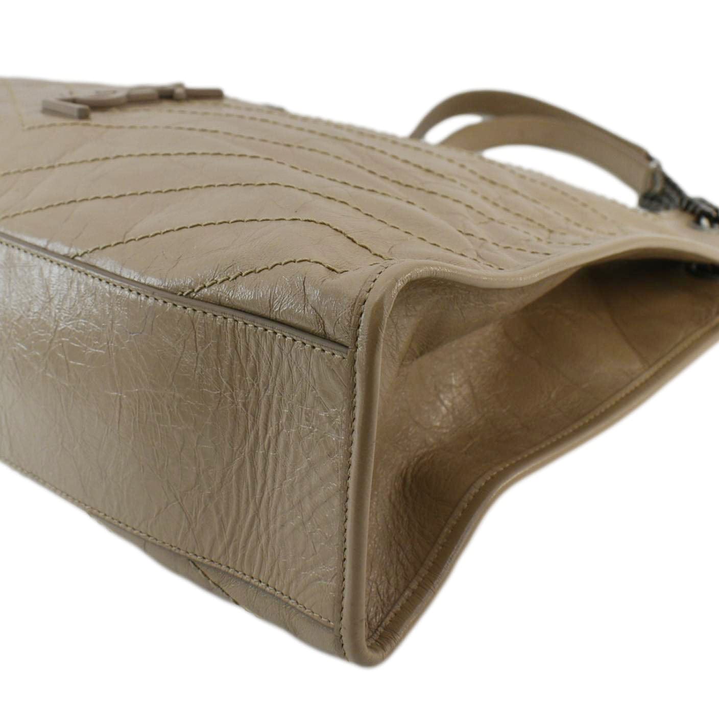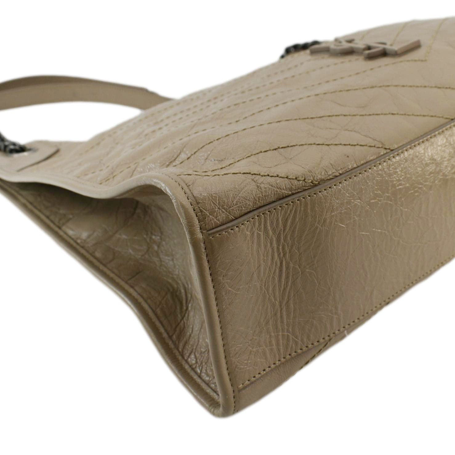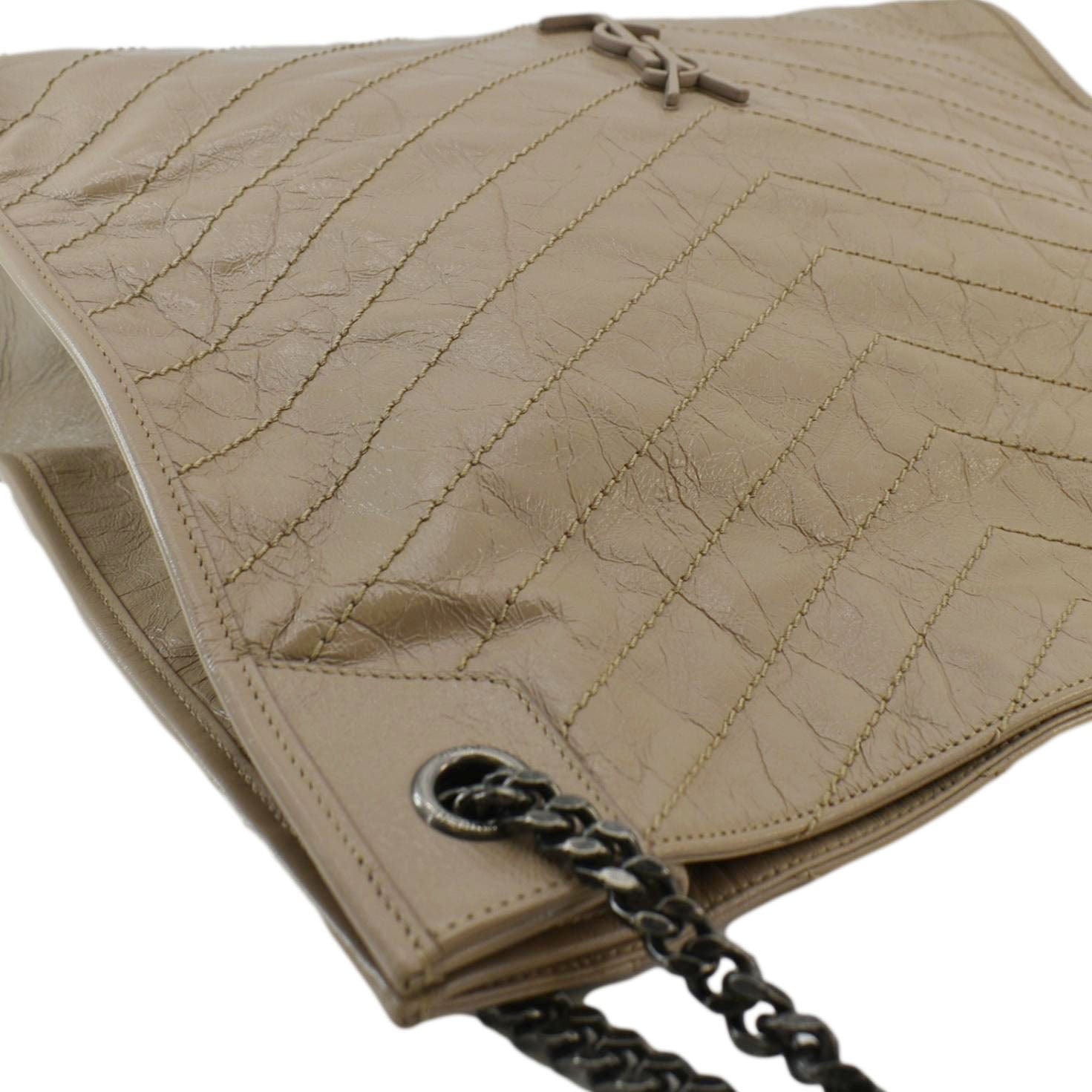 The Yves Saint Laurent Niki Shopping Tote in brown leather is a spacious and elegant bag with a vintage-inspired crinkled finish. It features the iconic YSL monogram in tonal hardware, offering a blend of luxury and functionality for everyday use.