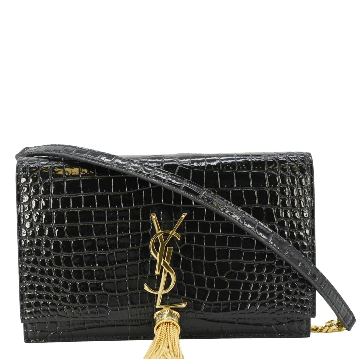 The Yves Saint Laurent Kate Crossbody Bag in black crocodile-embossed leather features a sleek design with a silver-tone YSL logo and an elegant tassel, exuding timeless sophistication.