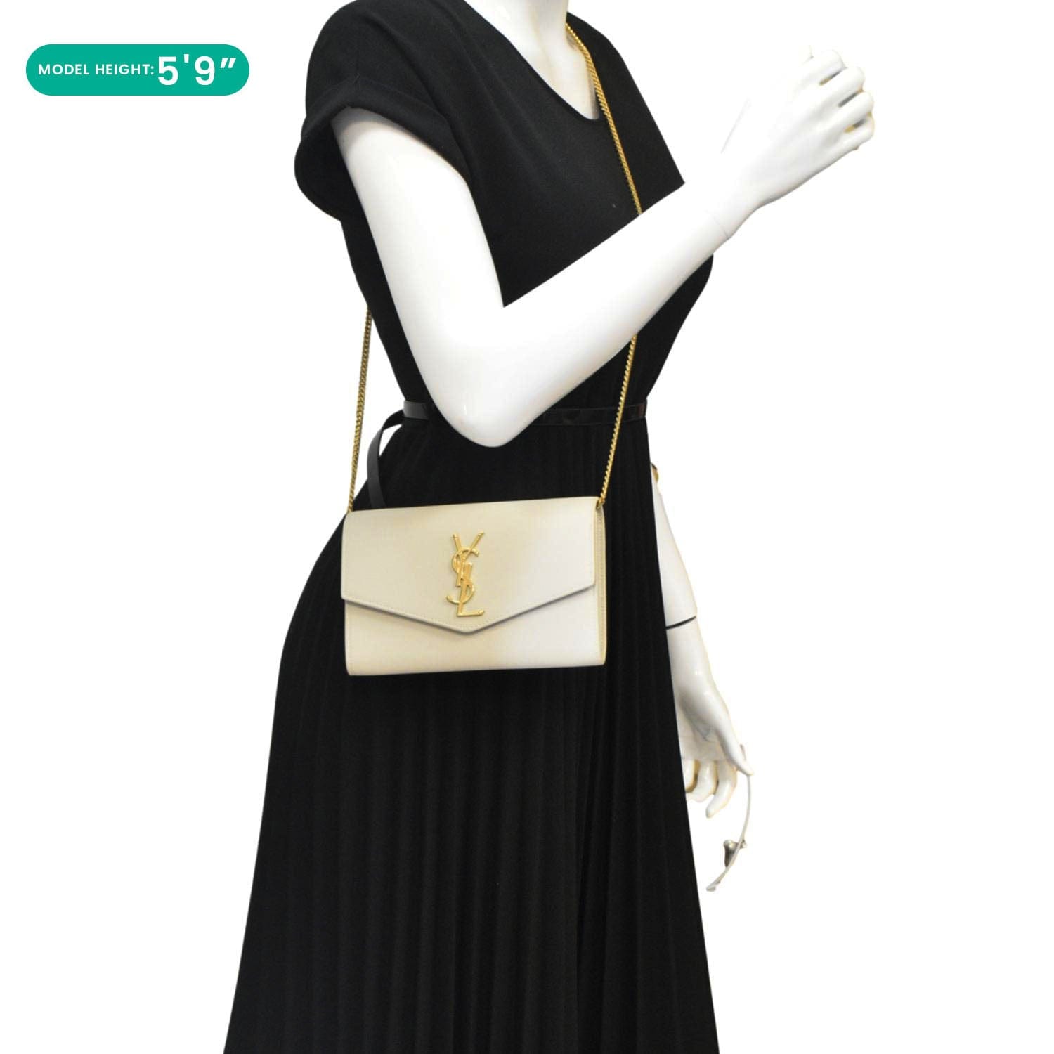 The YVES SAINT LAURENT Uptown Chain Wallet in white Grain de Poudre embossed leather features a sleek, textured finish with the iconic YSL logo. This elegant wallet-on-chain is perfect for a refined look, offering versatility and sophistication for day or night.